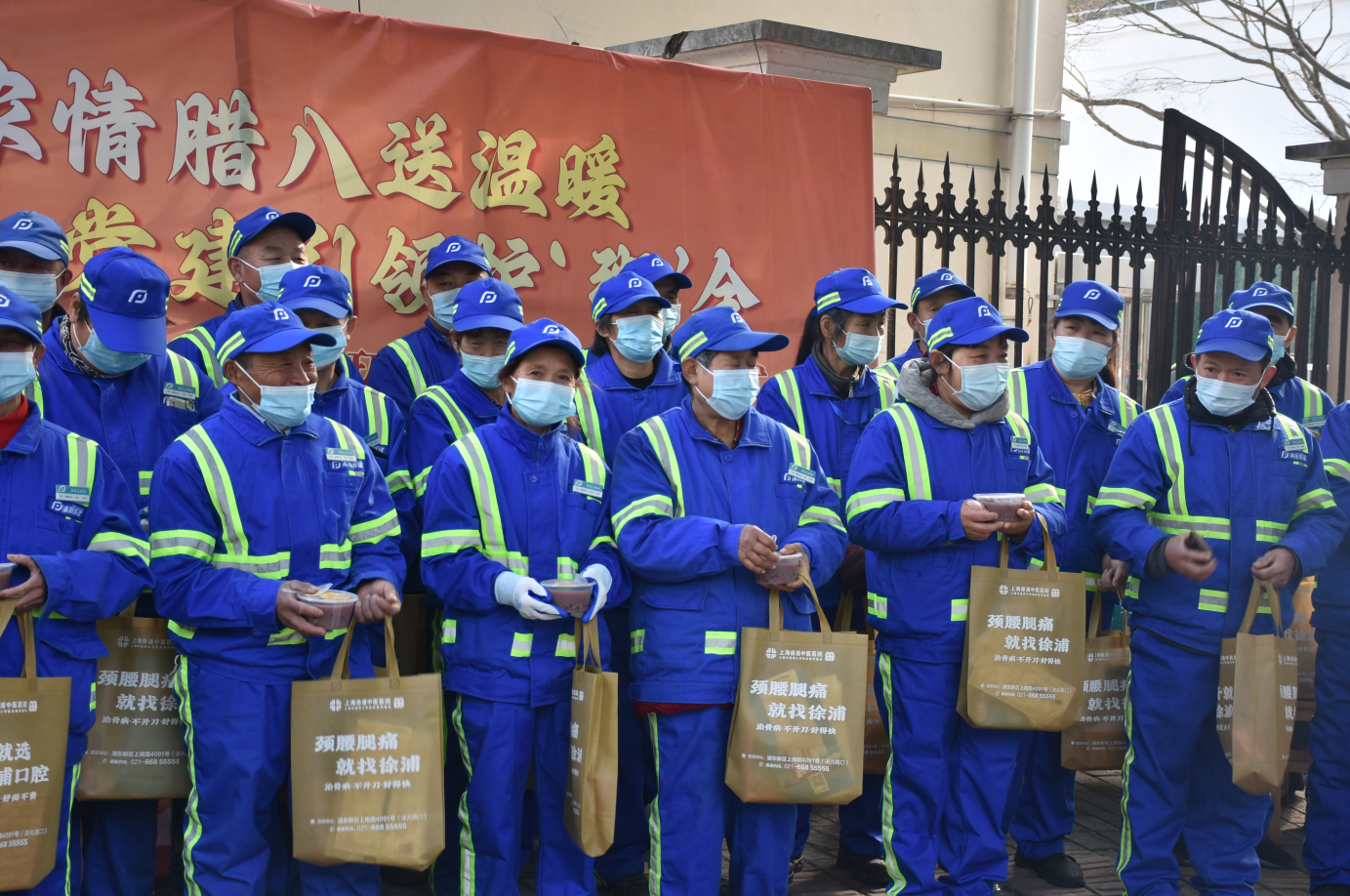 1月9日,上海徐浦中医医院联合上海浦林城建工程有限公司、浦东电视台开展“浓情腊八送温暖 党建引领护‘粥’全”关爱环卫工作者腊八慰问活动,将满载着祝福的50份腊八粥和中药足浴包,送到辛勤劳动的环卫工人手中,让“城市美容师”在寒冷的冬日感到温暖和关怀。