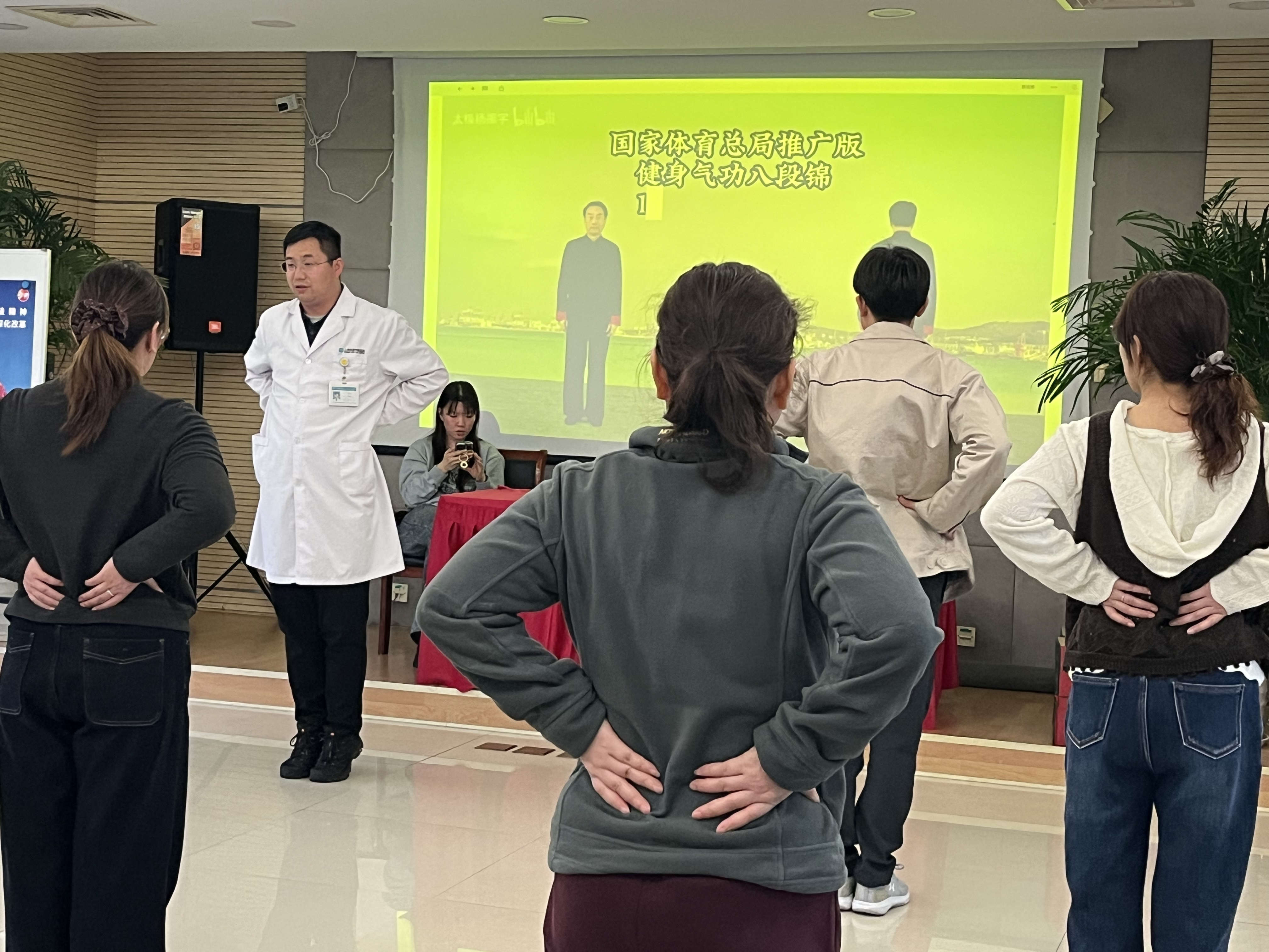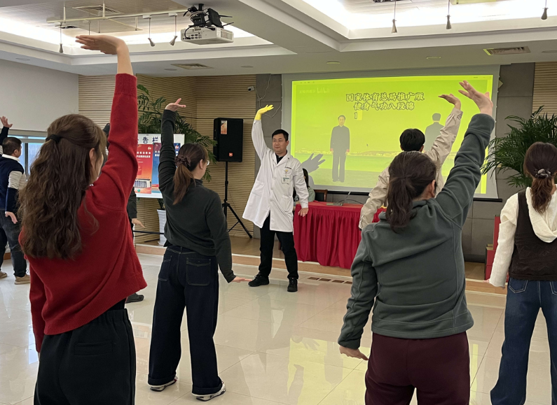 “´ó¼Ò×¢Ò⣬‘Á½ÊÖÍÐÌìÀíÈý½¹’Õâ¸ö¶¯×÷£¬ÏòÉÏÍоÙʱҪÂýÂýÎüÆø£¬¸ÐÊÜÐØÇ»µÄÀ©ÕÅ£¬ÊÖ±Û¾¡Á¿ÉìÖ±£¬Í¬Ê±´ø¶¯Ñü²¿µÄÀ­É죬ÕâÑù²ÅÄÜÊæÕ¹¼ç¾±ºÍÑü²¿µÄ¼¡Èâ¡£”Ò½ÉúÒ»±ßʾ·¶£¬Ò»±ßÄÍÐľÀÕýÔ±¹¤Ãǵ͝×÷¡£ÉϺ£ÐìÆÖÖÐÒ½Ò½ÔºµÄ¹ÇÉË¿ÆÒ½ÉúÊ×ÏÈÏòÔ±¹¤ÃǽéÉÜÁ˰˶νõµÄÆðÔ´¡¢ÑøÉúÔ­ÀíÒÔ¼°¶Ô¸ÄÉÆ¼ç¾±Ñü×µÎÊÌâ¡£